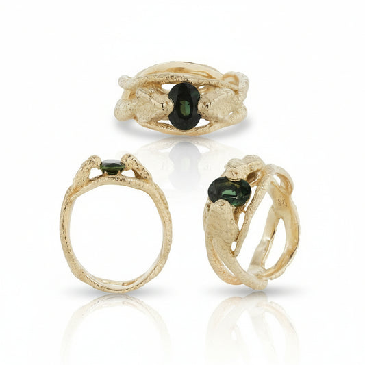 Slithering Snakes Ring – Recycled 14k Gold with Green Sapphire