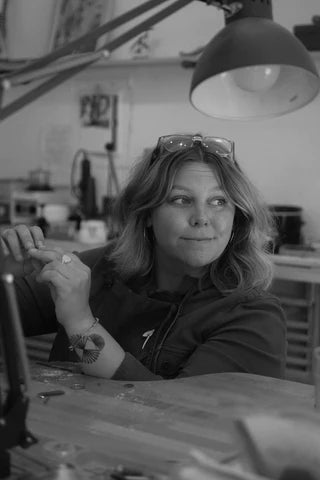 Erin Cuff creates stunning handmade jewelry in Northern California, drawing inspiration from her background in photography, art, and woodworking. Her pieces are crafted from sterling silver and solid 14k and 18k yellow gold, and inspired by the desert, modernism, mid-century design, folk art, and the southwestern United States. Erin's grandmother, a classically trained jeweler and gemologist, is her biggest inspiration. Erin learned silversmithing in Guanajuato and worked in the goldsmithing industry for over a decade. Her jewelry is both elegant and utilitarian, built to last a lifetime.