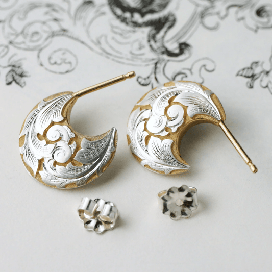 Hand Engraved Leaf Stud Earrings - Solid 14k Yellow Gold or Sterling Silver