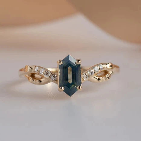 Pine Sapphire Ring – 14k Yellow Gold Hexagon Sapphire and Diamond Leaf Ring