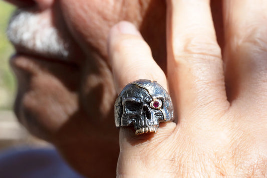 Skull Ring “Macbeth’s Fate” - Oxidized Silver & 14k Gold with Ruby Eye