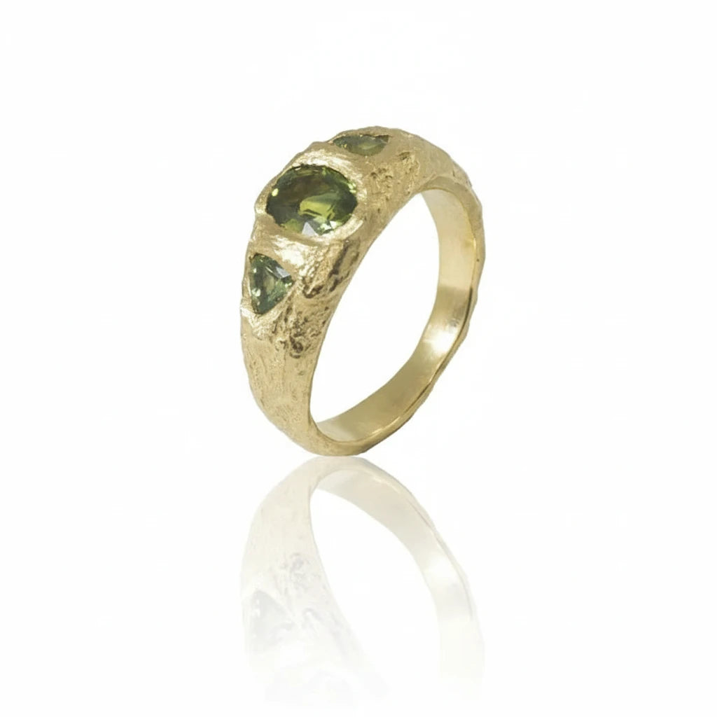 Formed from a single block of wax and carved with geological texture, this bold 14k recycled yellow gold ring has striking weight, presence, and sculptural detail. Each piece encases three phenomenal sapphires – offered with green/blue natural Montana Sapphires or soft, light Pink Sapphires. Substantial, one-of-a-kind, and rich with craft, it's a true statement ring for collectors who love gemstones with character.