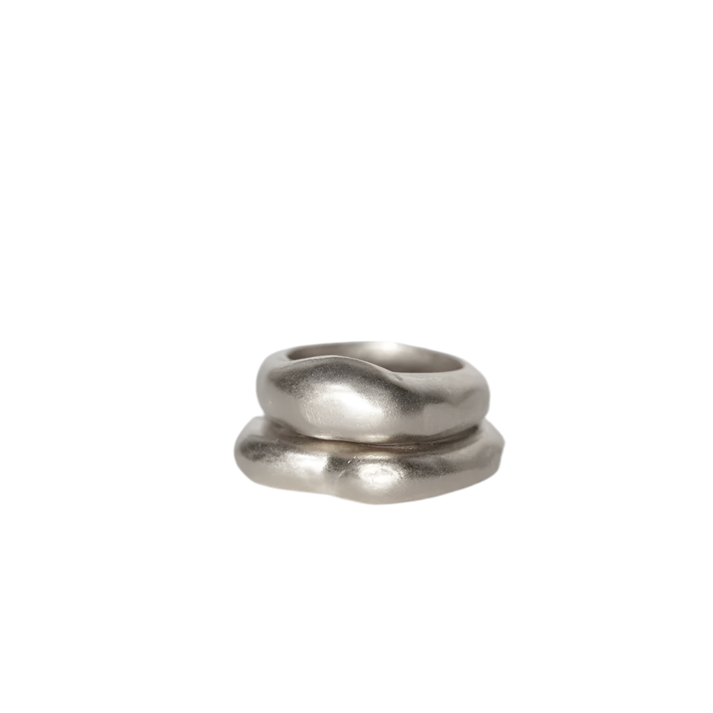 A set of two sterling silver rings by Maggie Kyle Rogers of Oxbow. The two rings are formed from organically carved wax to mimic mountains and hills.