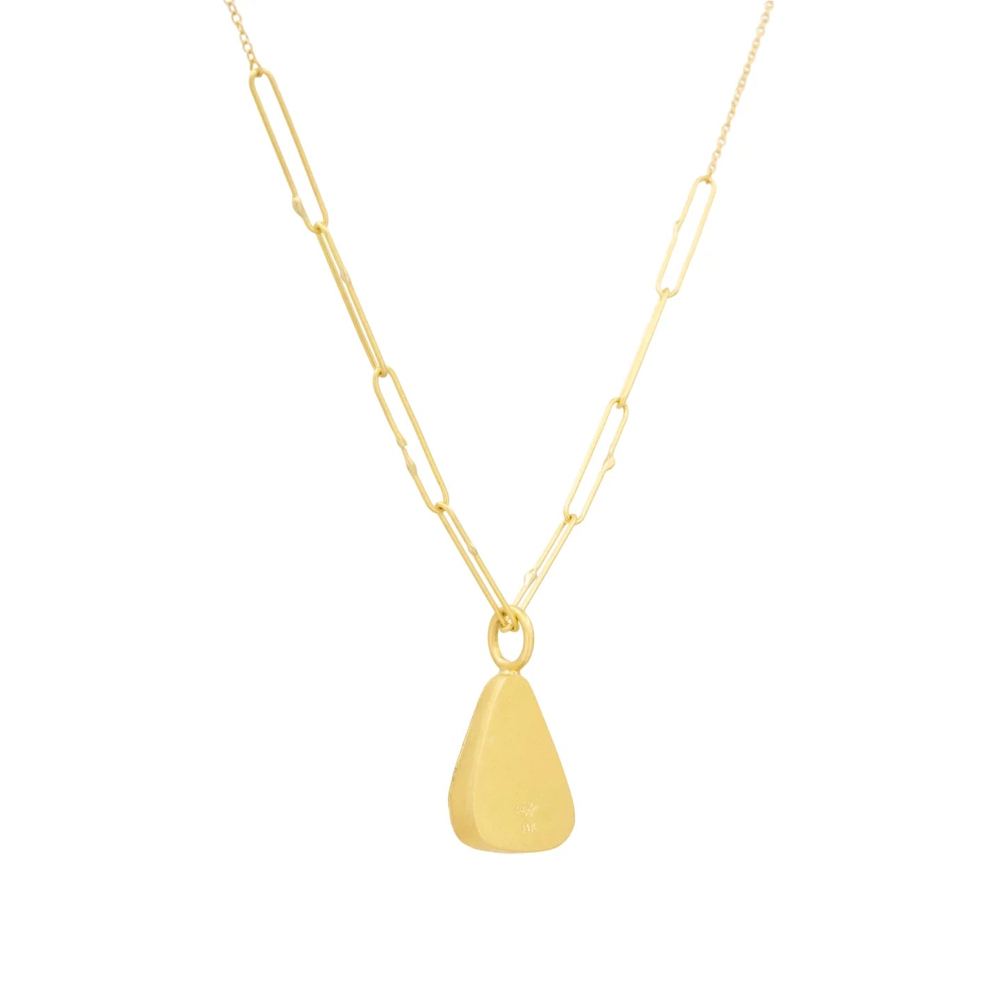 This truly unique natural Opal features a wide array of pastel colors, almost capturing the rainbow. It is set in a rich 18k gold bezel that has been hand engraved by the artist. A truly one of a kind piece. Pendant only. Add to your own chain or pair with one of Erin’s beautiful, hand-crafted chain options.