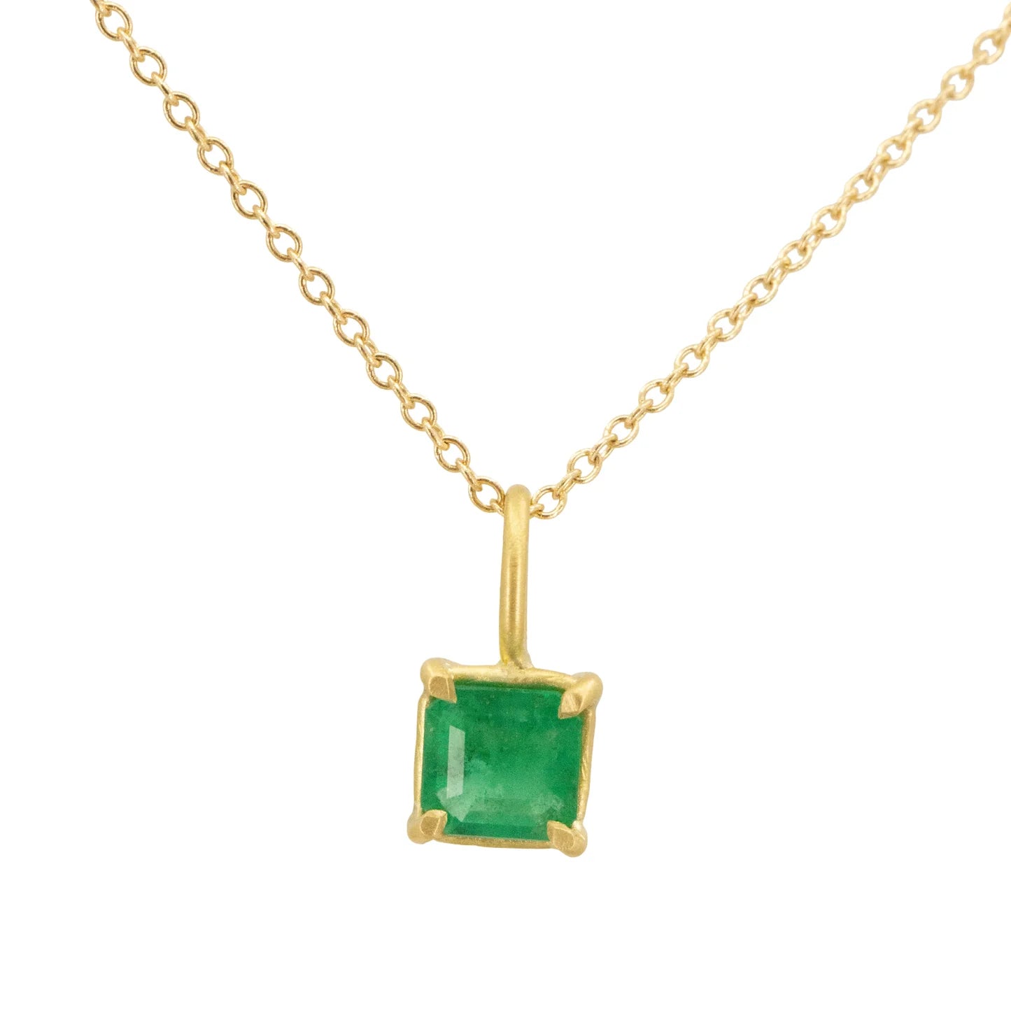 This tiny Emerald basket pendant packs a punch with a bright green set in rich 18k gold. Pendant only. Add to your own chain or pair with one of Erin’s beautiful, hand-crafted chain options.
