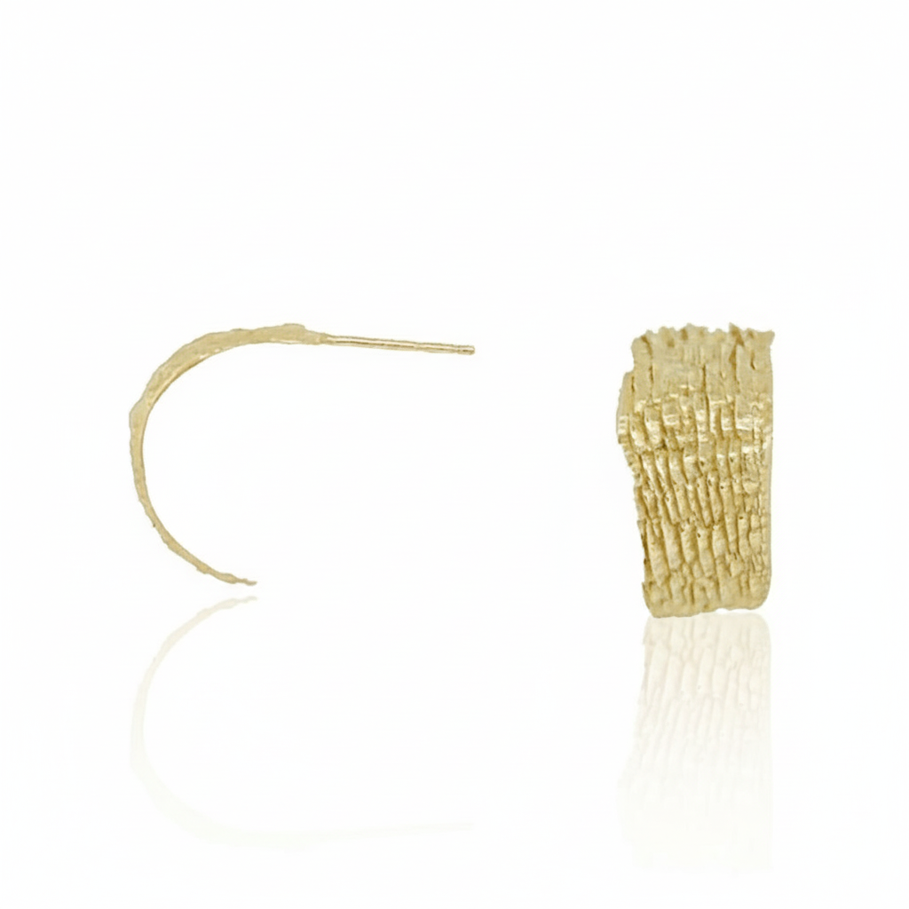 Inspired by the Earth’s layered geological formations, these extremely lightweight hoops echo the textures shaped by material, heat, and time. Each pair is hand carved to reveal a fractured, sediment-like surface that glows with organic character. Available in 14k yellow gold, 14k white gold, or sterling silver, these hoops offer a refined yet elemental expression of natural beauty.