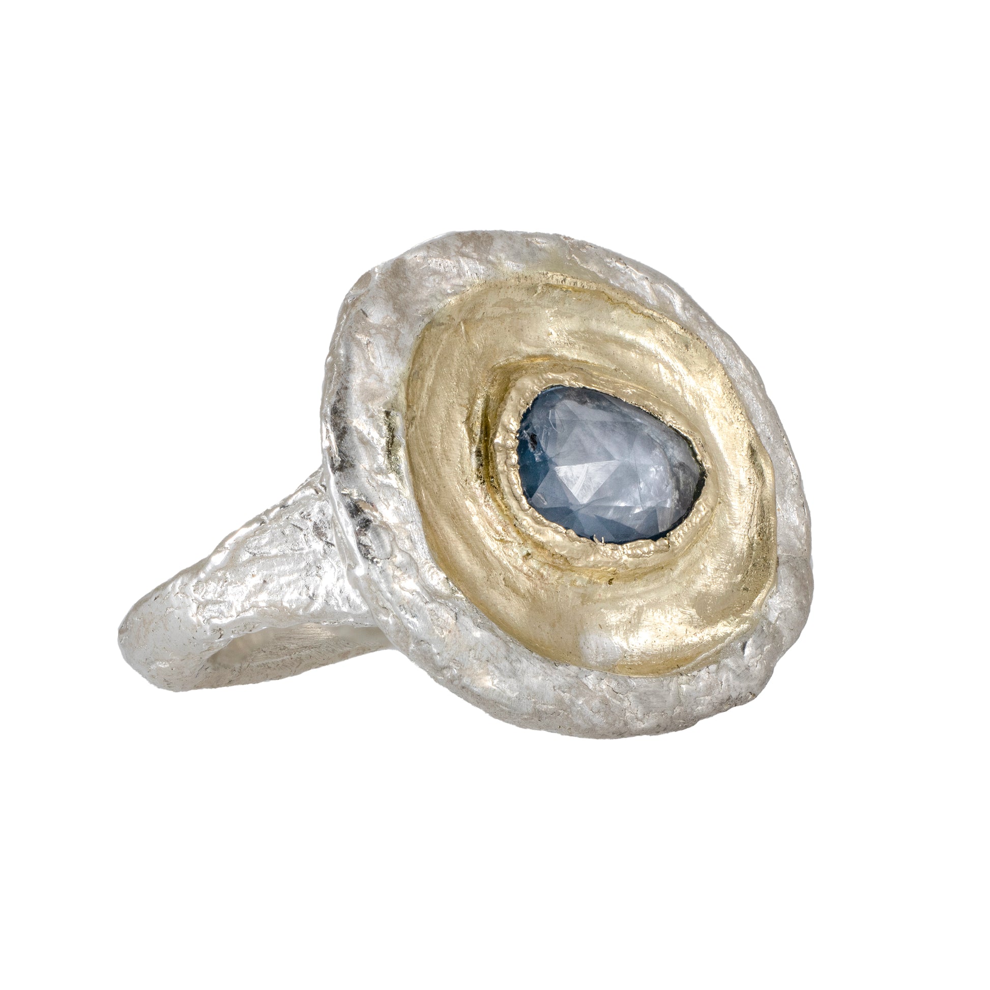 This beautiful one-of-a-kind mixed metal ring has a sterling silver ring band and aura which holds a 14k yellow gold bezel and encompasses a beautiful blue rose cut Sapphire. Euro shank band for an extra comfortable fit.