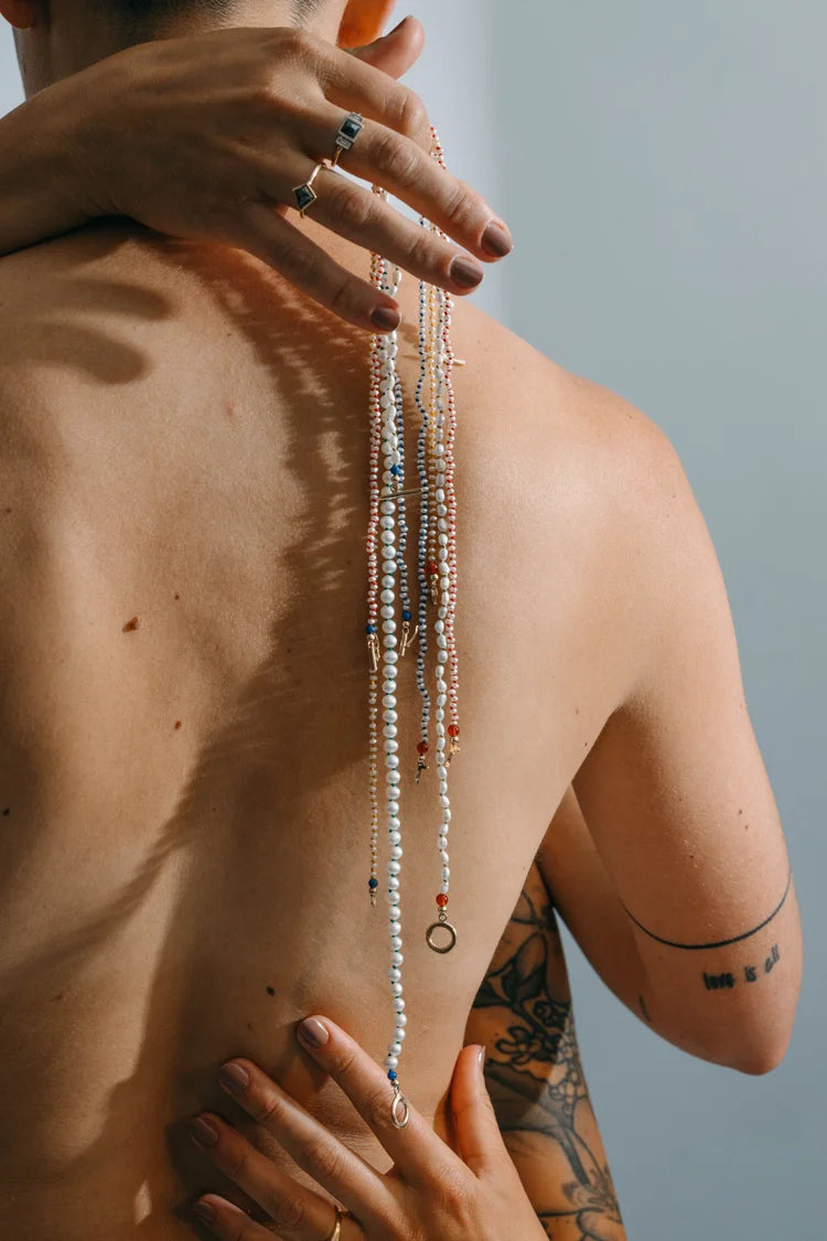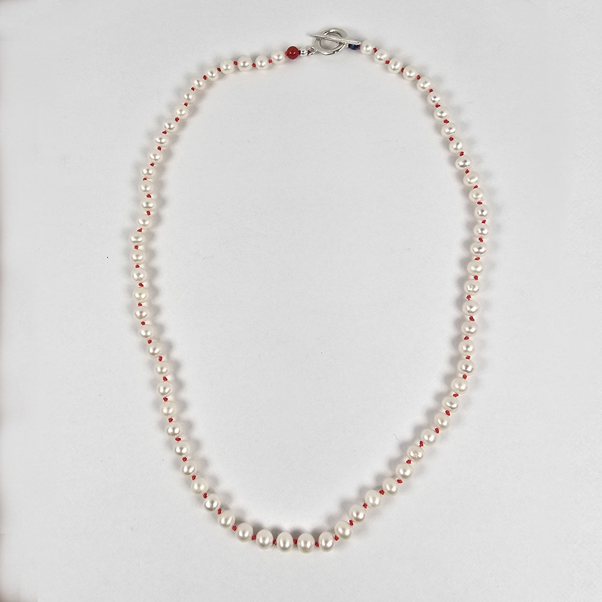 A beautiful strand of freshwater pearls, hand-knotted one by one on coral colored silk. This elegant necklace features a sterling silver toggle clasp and is finished with a small touch of color from lapis beads.