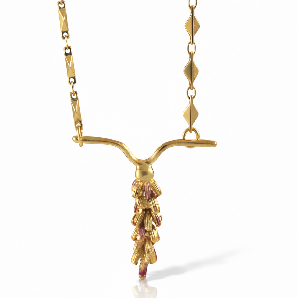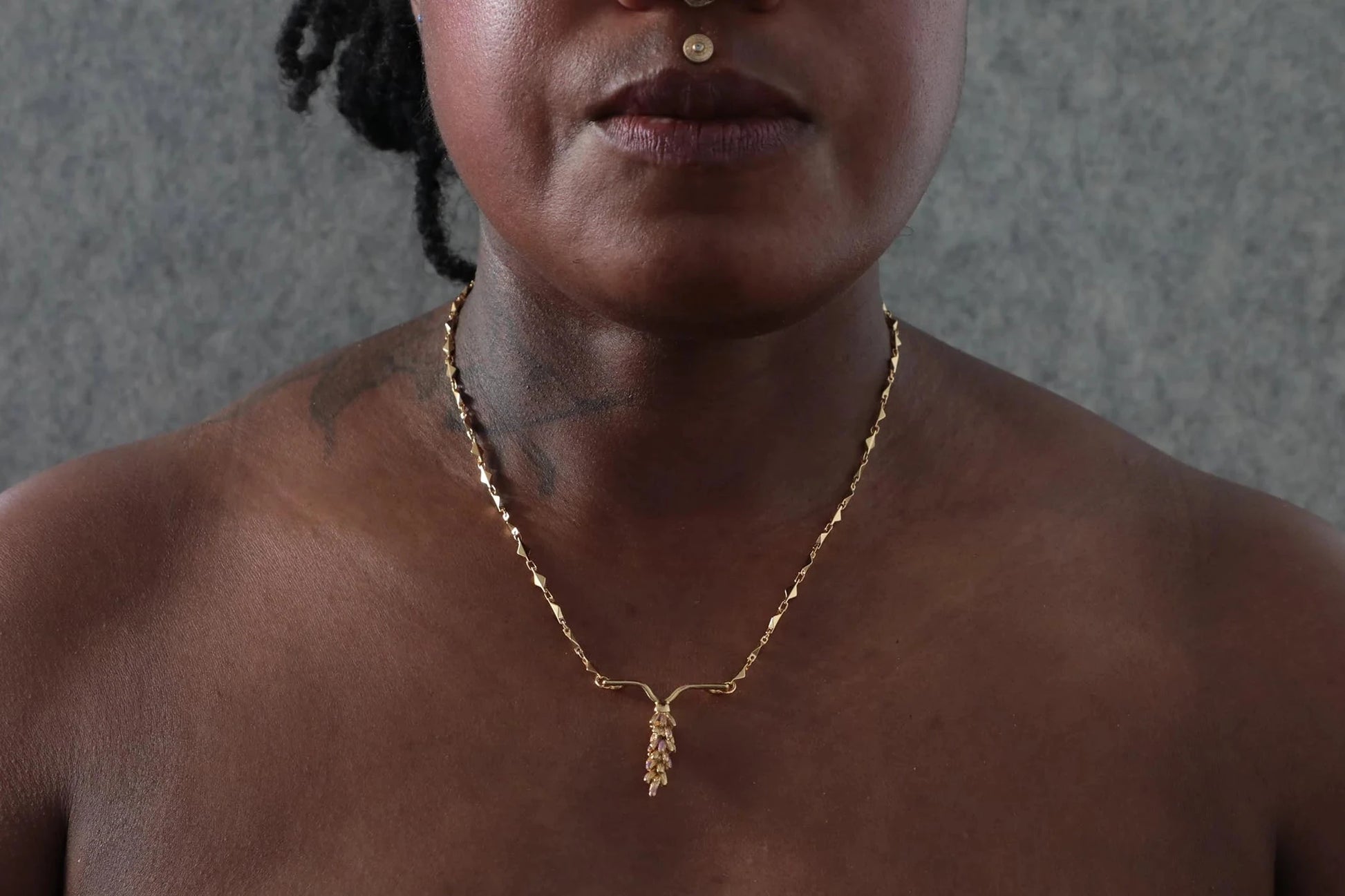 A beautifully balanced botanical necklace with a soft, modern edge. This Deserted Flower design features a sculptural lavender-inspired form that drapes gracefully from a contemporary shaped chain.