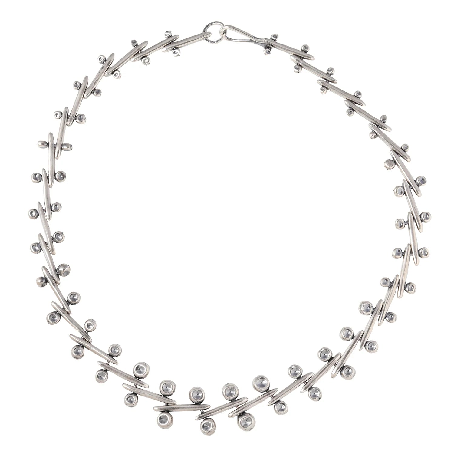 Erin Cuff has created one of the most astonishing hand-fabricated chains you will ever lay eyes on. The kinetic chain statement necklace is slinky, fluid and sits like a piece of fabric across the neck. It is crafted from recycled sterling silver with a slightly oxidized finish, making it a must-have piece for any necklace collector.