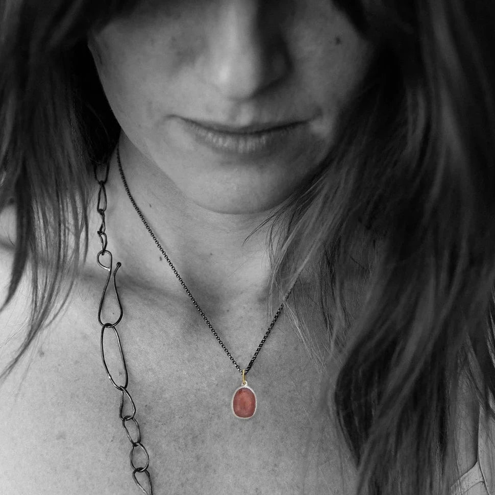 Dazzle and shine with our Pink Sapphire Shimmer Pendant. This striking piece features a vibrant rose-cut pink sapphireframed by sculpted recycled sterling silver and topped with an elegant 18k yellow gold bail. Soft matte silver gives the stone a refined, understated glow, perfect for everyday wear or a special pop of color.