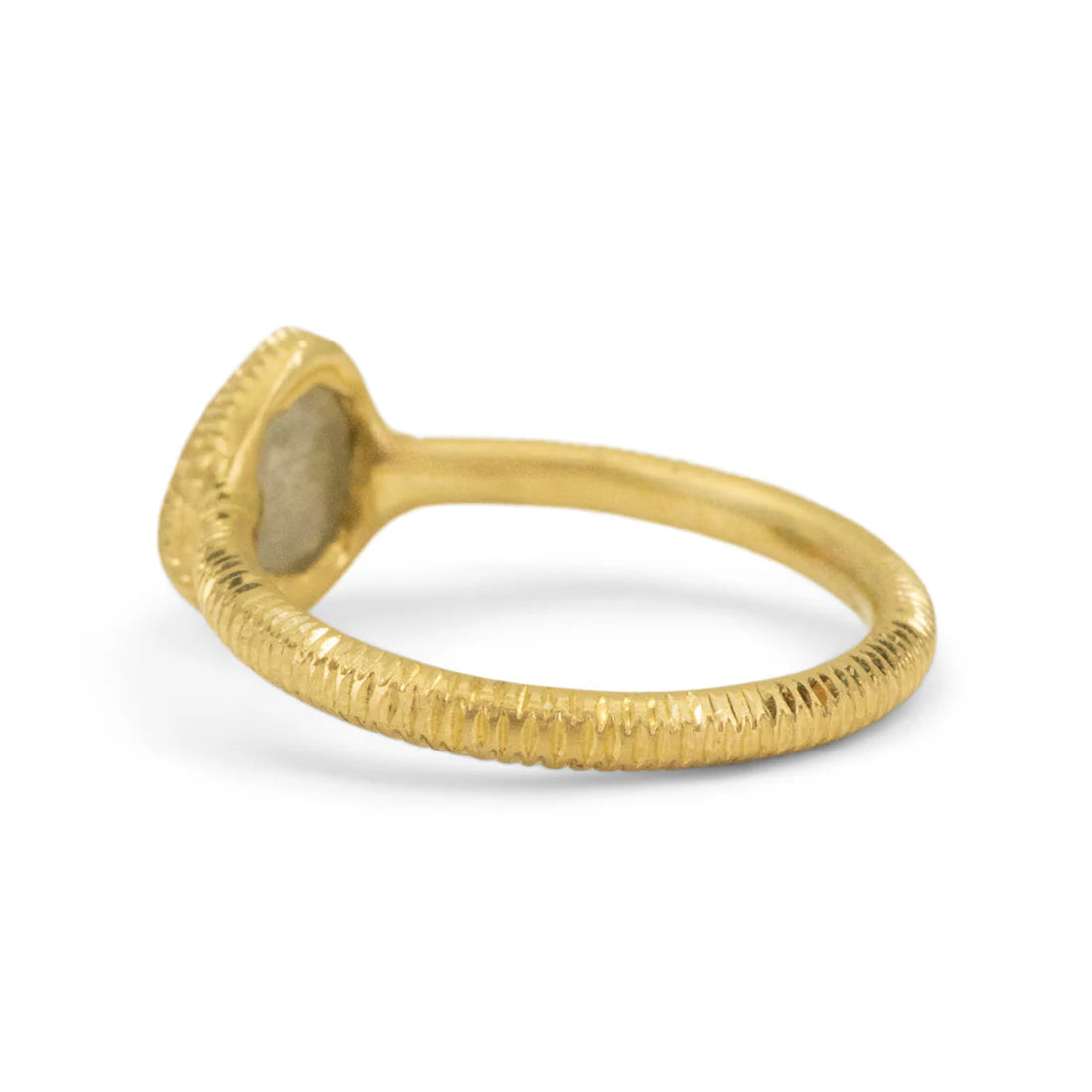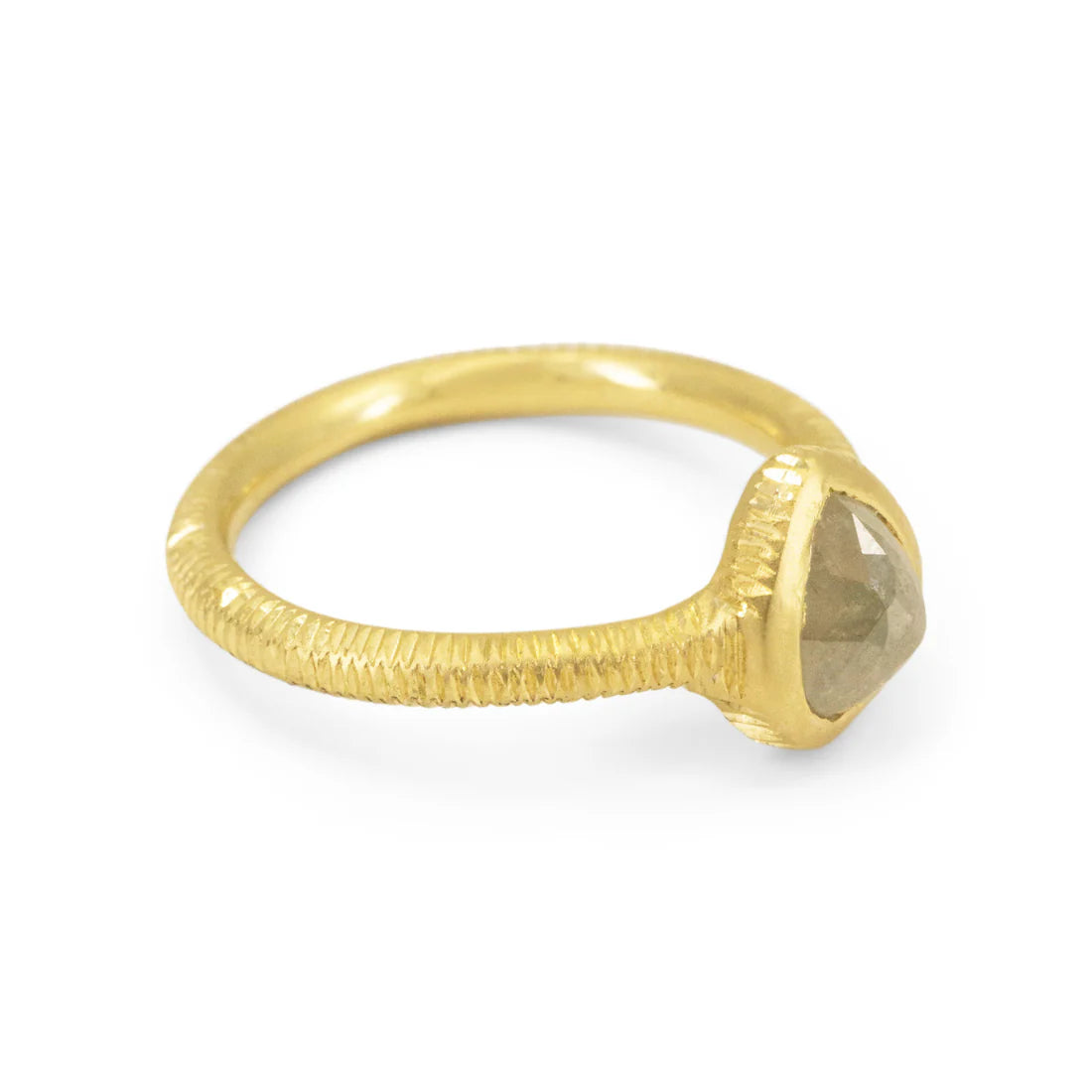 A truly unique rosecut pear diamond set into an 18k band with ornamental hand engraved patterns.