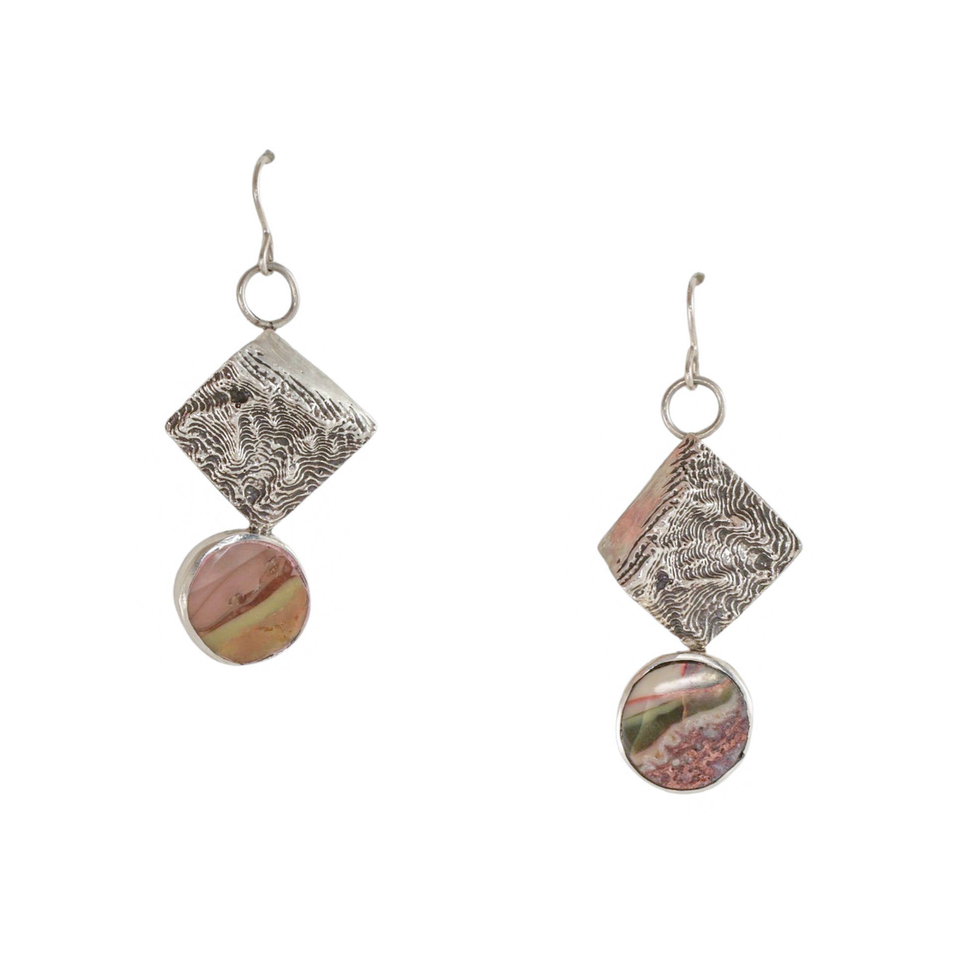 Inspired by the dramatic topography of the Sandia Mountains, these dangle earrings pair textured sterling silver with richly colored agate slices that feel like tiny landscapes of their own. Each stone displays natural bands and warm earth tones, creating subtle movement and a beautiful contrast against the silver.