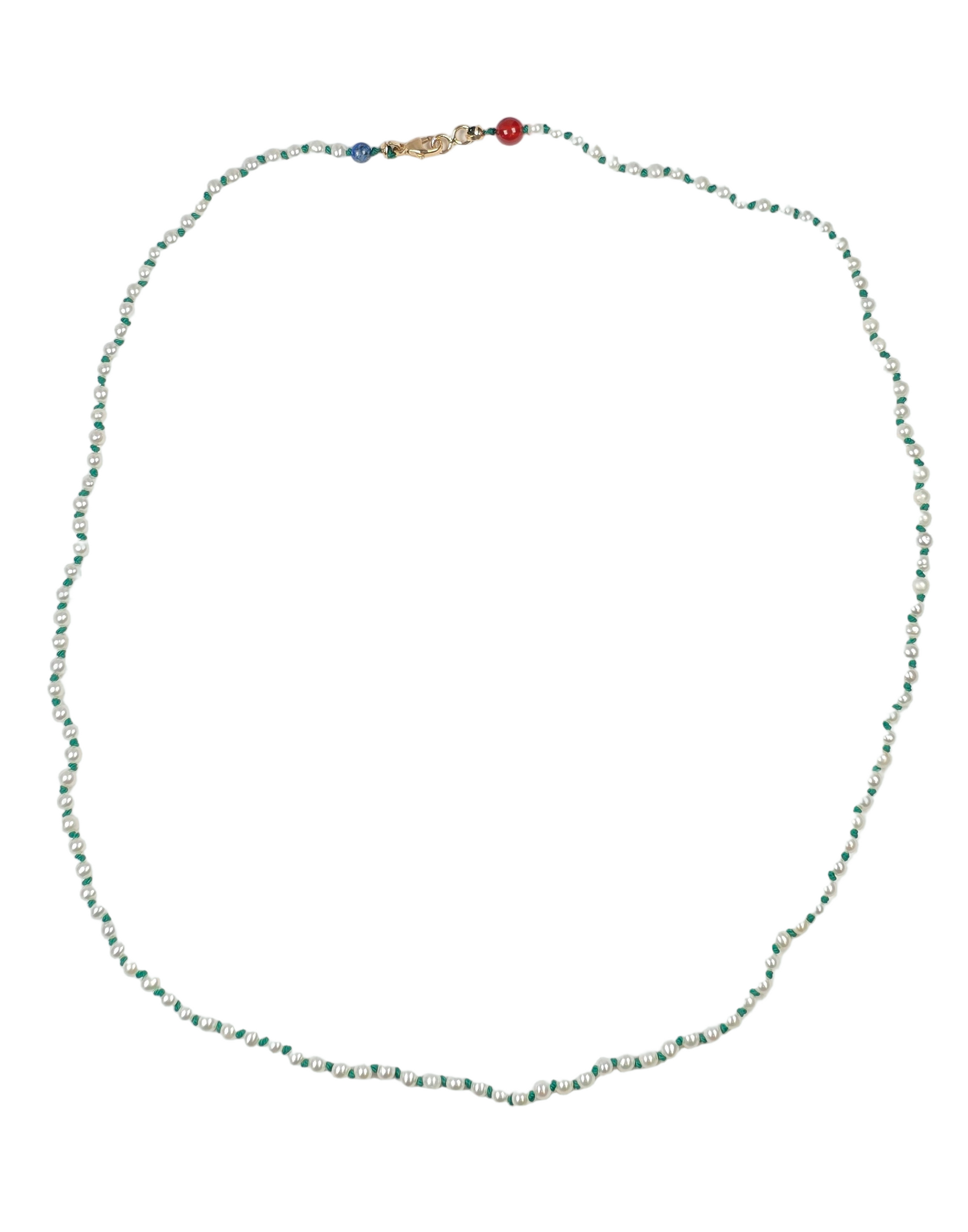 A delicate strand of tiny seed pearls, hand-knotted one by one on kelly green silk. This elegant necklace features a 14k yellow gold lobster clasp and is finished with a small touch of color from lapis beads.