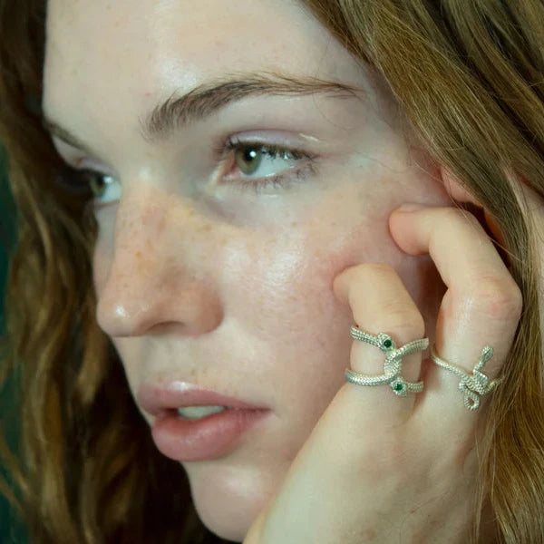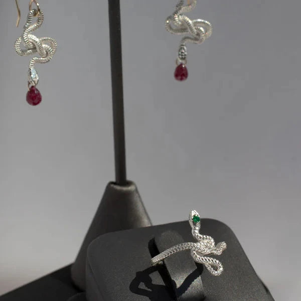 This symbolic Snake Guardian Ring embodies transformation, intuition, and protection. The serpent’s open-mouthed design wards off negativity, while the Zambian emerald set in its head represents renewal and spiritual awareness.