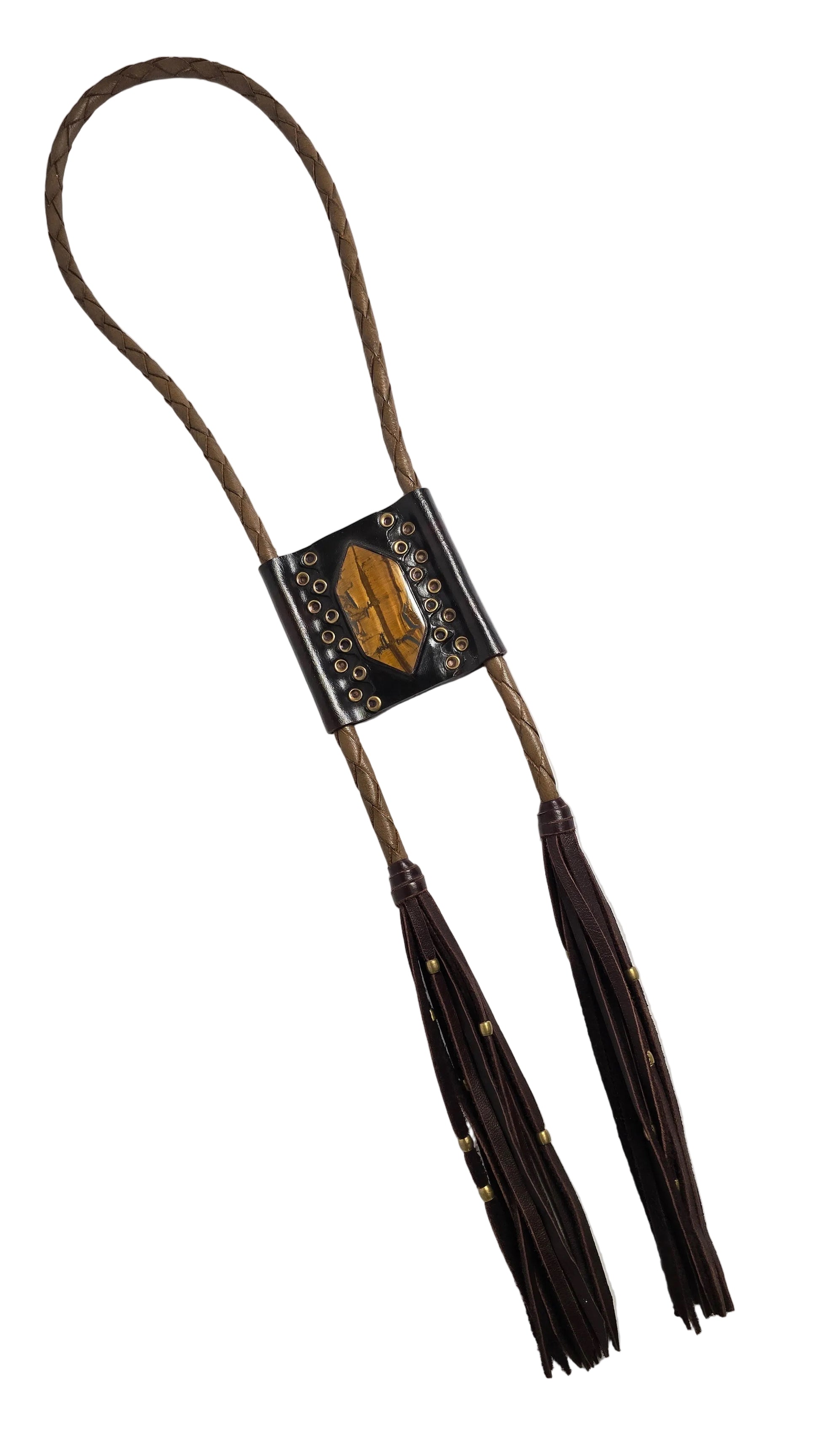 This bold statement bolo tie showcases a polished tiger’s eye stone framed in hand-tooled veg-tanned leather, accented with antiqued brass rivets and long deerskin tassels. Designed with a flexible fit and crafted with meticulous detail, it brings a refined Western elegance to any collection.