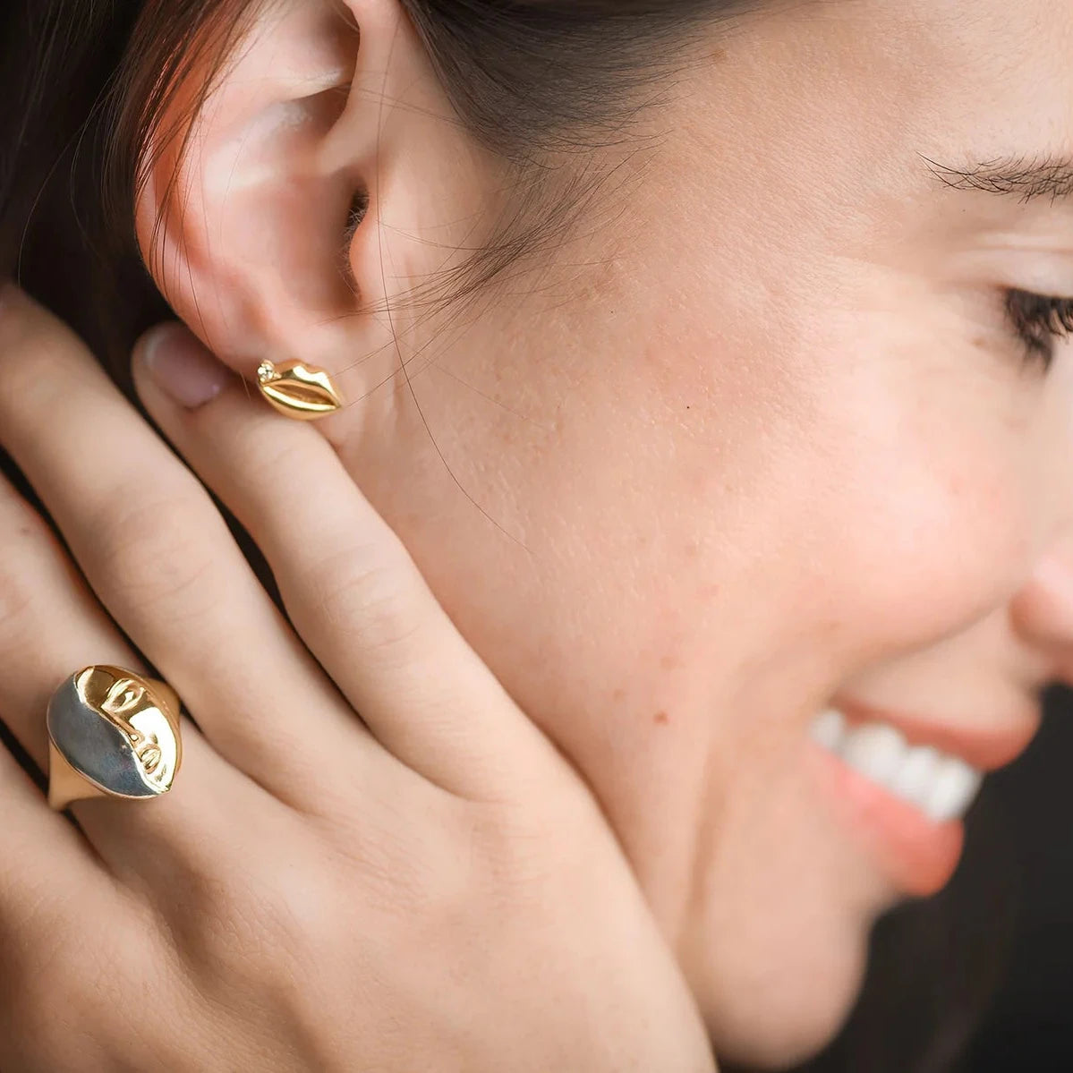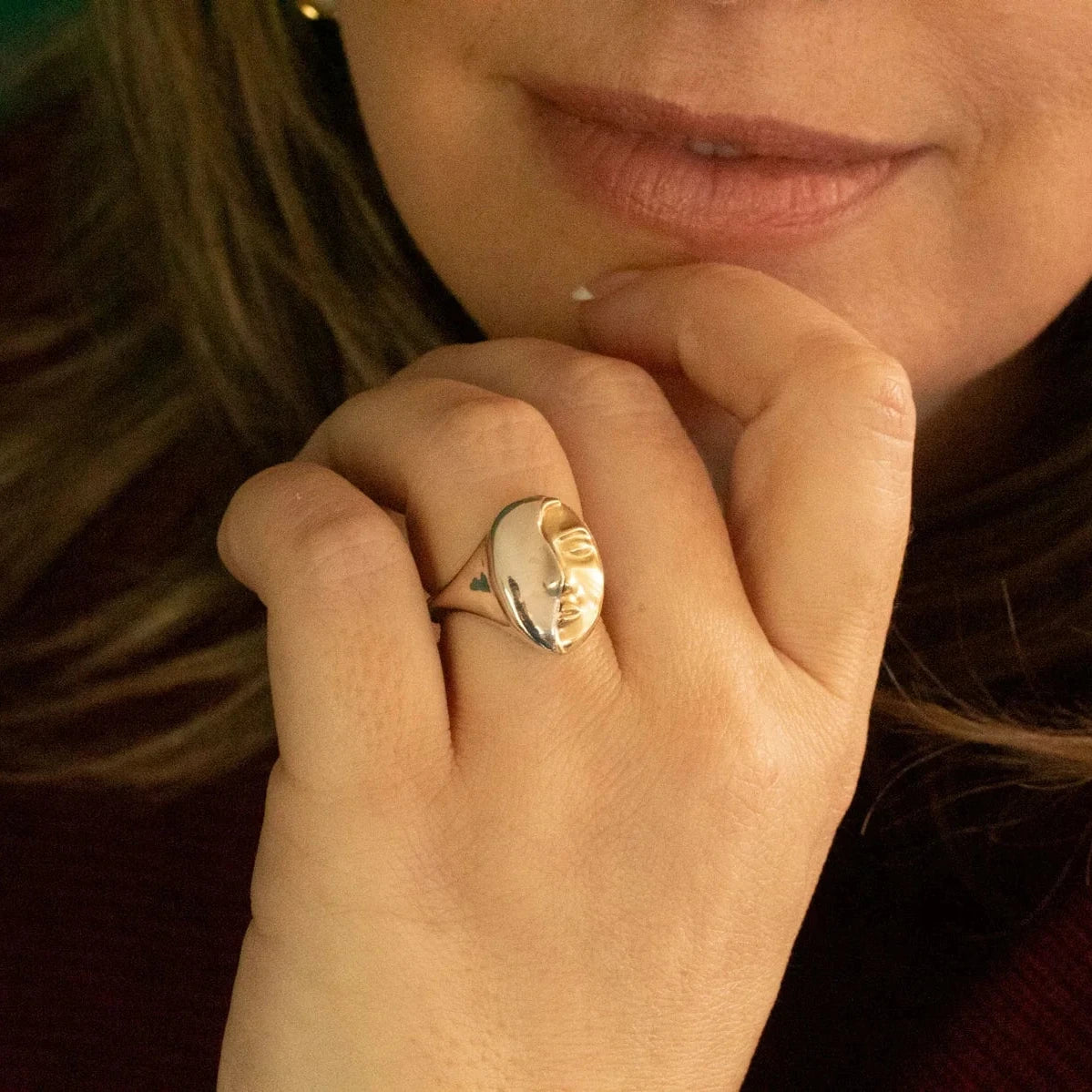 This sculptural ring echoes the spirit of Michaela’s “Her Ring” but with a more enigmatic presence. The feminine contours and serene expression are half-shrouded in mystery, creating a powerful balance of softness and depth.