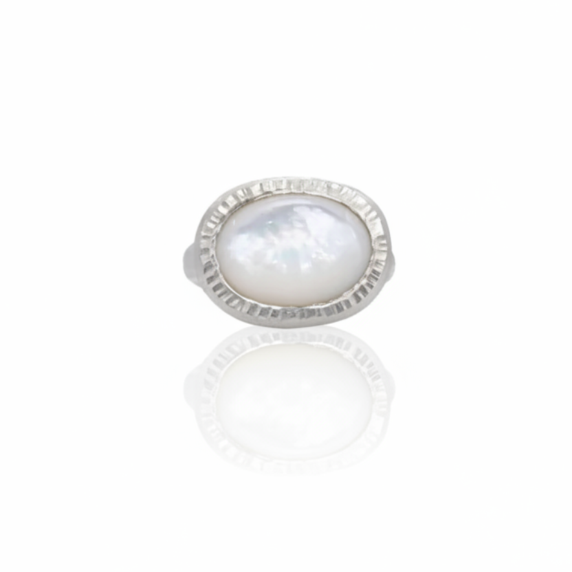 A luminous statement ring showcasing natural mother-of-pearl set into sculpted sterling silver. The stone is horizontally placed in a fluted bezel that catches the light beautifully, creating a soft, iridescent glow with every movement. A refined matte exterior pairs with a high-polish interior for a smooth, comfortable fit. Elegant yet bold, this ring is designed for those who appreciate quietly powerful jewelry.